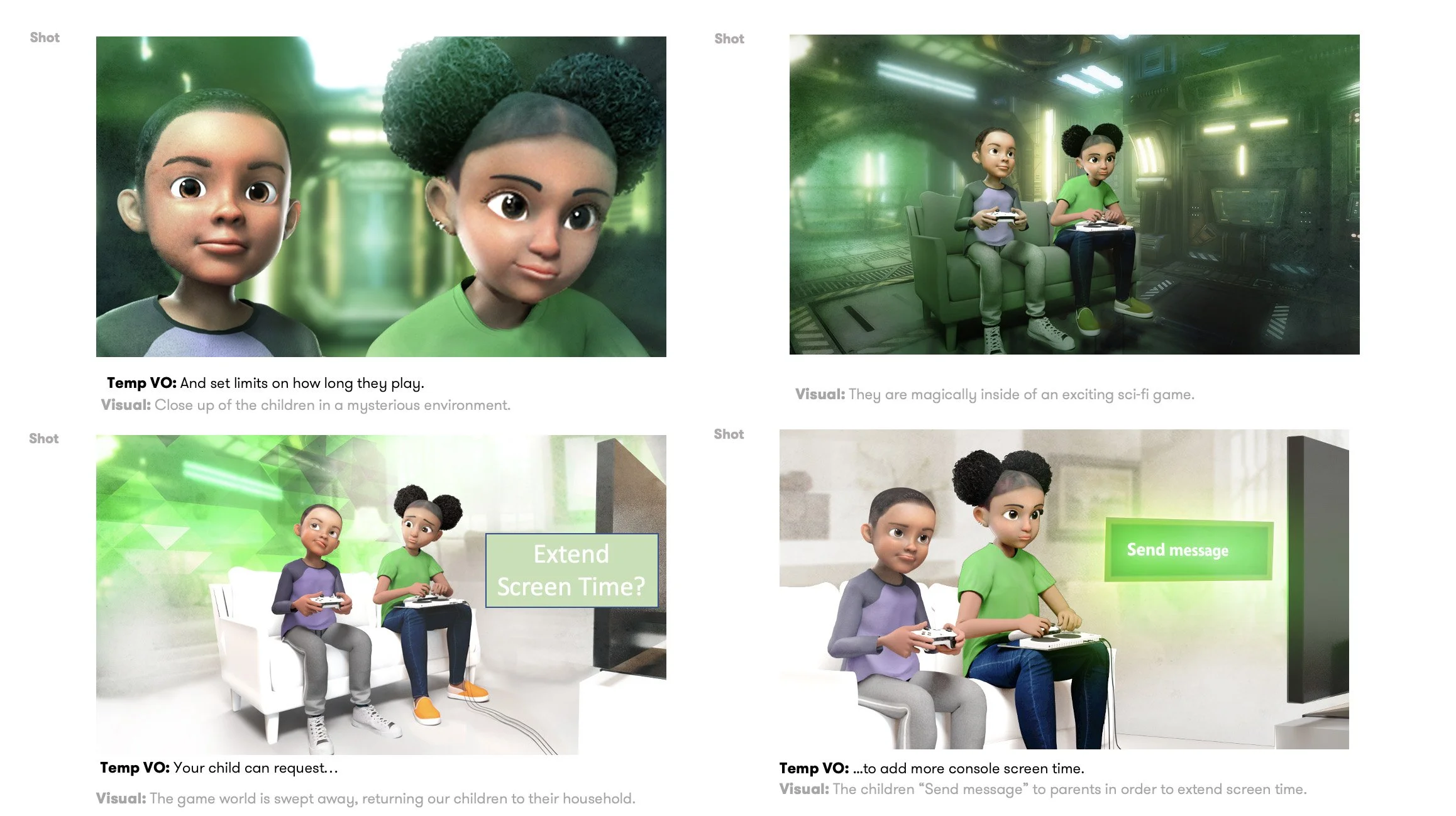 To bring Xbox’s Family Settings experience to life, we developed a full creative pipeline that blended research, visual exploration, and iterative 3D animation. These behind‑the‑scenes frames show how we shaped the narrative, refined character performance, and built a cohesive visual language that makes the product intuitive for parents and kids alike.